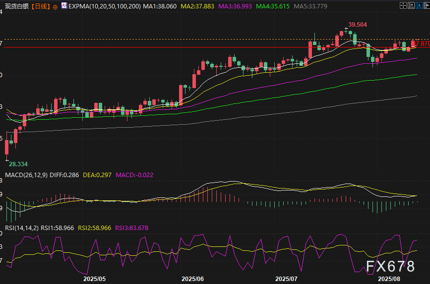 汇通财经APP讯——周四(8月14日)亚市,现货白银延续周三涨势,现在交投于38.58美元/盎司附近,涨幅约0.28%,逼近隔夜创下的近两周高点;周三现货白银上涨了1.63%,受市场押注美联储降息以及美国10年期国债收益率暴跌提振。