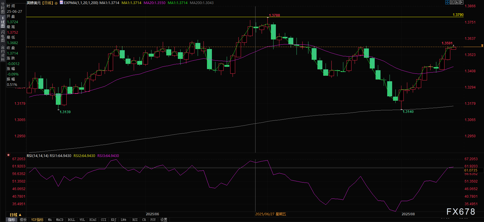 下行方面,8月11日低点1.3400构成关键支撑区域;而上行方向,7月1日高点1.3790附近将形成重要阻力位。