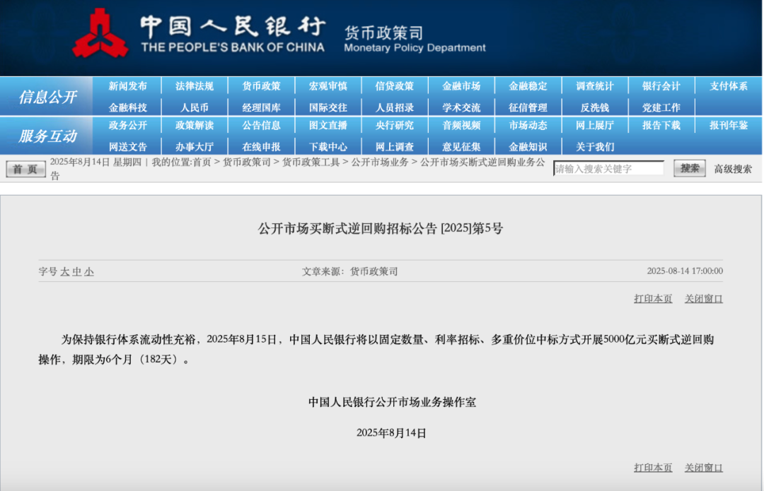 8月14日,央行发布公开市场买断式逆回购招标公告 [2025]第5号。公告称,为保持银行体系流动性充裕,2025年8月15日,中国人民银行将以固定数量、利率招标、多重价位中标方式开展5000亿元买断式逆回购操作,期限为6个月(182天)。