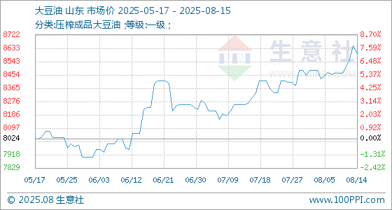 8月15日,生意社大豆油基准价为8598.00元/吨,与本月初(8454.00元/吨)相比,上涨了1.70%。