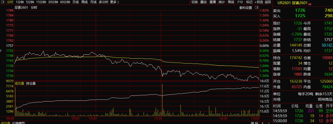 当日,尿素期货价格下跌,截至收盘,尿素期货主力2601合约报收于1726元/吨,跌幅1.76%。