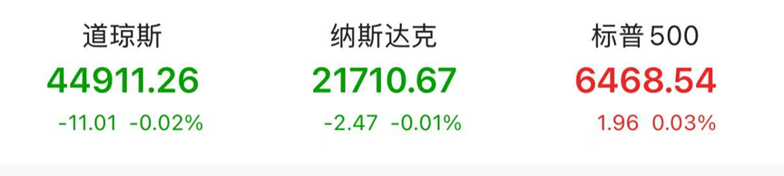 美股三大指数收盘涨跌不一。截至收盘,标普500指数涨0.03%,报6468.54点,续创收盘历史新高;纳斯达克综合指数跌0.01%,报21710.67点;道琼斯指数跌0.02%,报44911.26点。