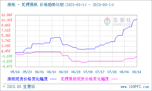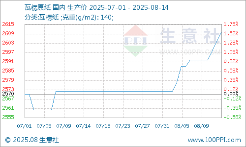 据生意社商品行情分析系统:本周瓦楞纸价格保持上行走势。2025年8月14日瓦楞原纸140g出厂均价为2610元/吨,与8月10日均价相比上涨了0.69%。