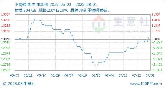 8月1日生意社不锈钢基准价为13080.00元/吨
