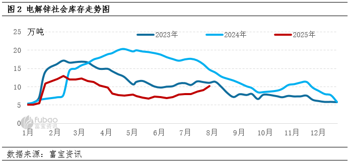 其次,2025年下半年,国内继续推进基建投资,尤其是在新能源、电网改造等领域,镀锌钢材需求有望回升。此外,随着房地产政策边际放松,部分城市楼市销售回暖,或带动建筑用锌需求。具体到8月下旬来看,一方面,黑色系价格仍维持高位,若这一趋势延续,镀锌行业开工率有望进一步提升,从而提振锌需求;另一方面,9-10月是锌消费的传统旺季,下游企业通常会在8月下旬开始备货。若宏观环境保持稳定,叠加冶炼厂检修结束后,复工节奏偏慢,供应增量或有限,锌市场供需矛盾有望缓解,社会库存或逐步进入去库通道,价格或迎来阶段性上涨。
