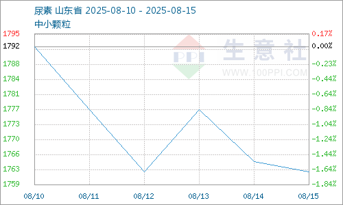 据生意社商品行情分析系统,截止8月15日,国内尿素市场参考均价为1762元/吨,较8月10日市场参考均价1792元/吨,本周国内尿素市场价格下跌幅度为1.67%。