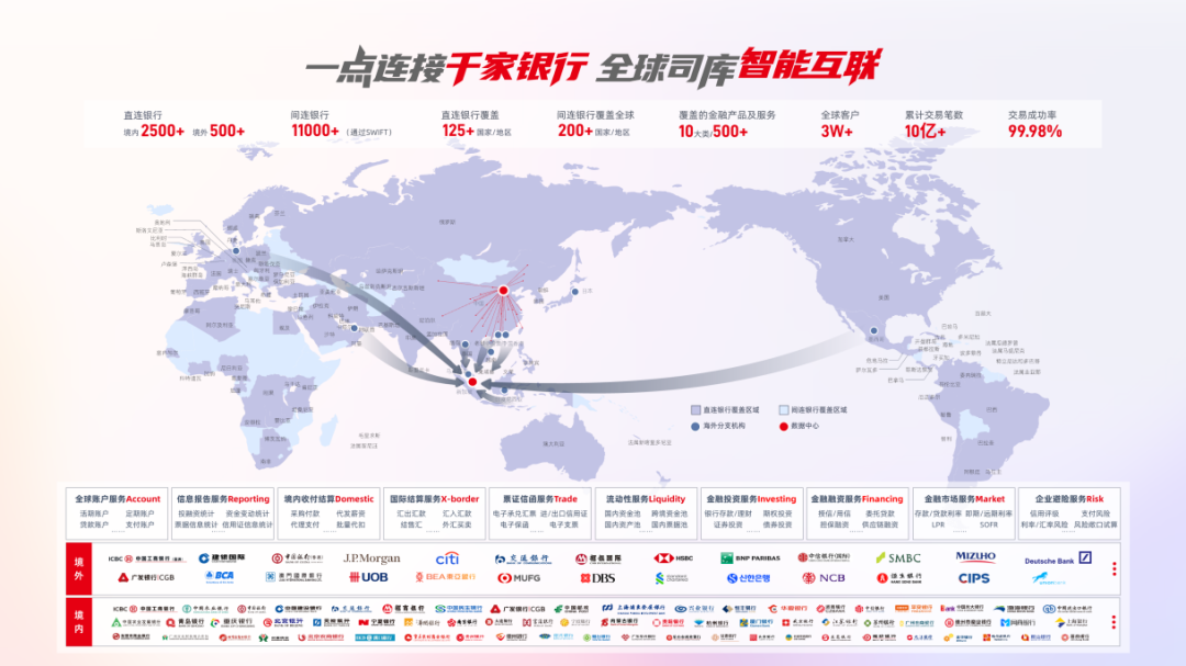多币种、多时区、多汇率支持:覆盖ISO20022标准与SWIFT协议,支持2500+境内银行与500+境外银行直联,企业可实时掌控全球账户状态、跨境结算进度与外汇风险敞口。