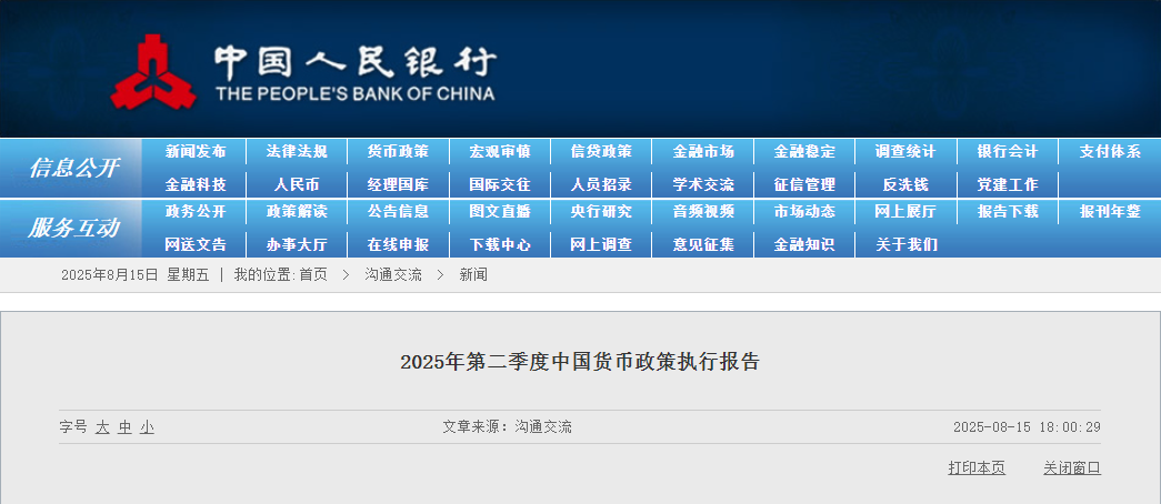 中国人民银行(下称“央行”)8月15日发布《2025年第二季度中国货币政策执行报告》(下称《报告》),总结上半年货币政策执行情况,分析当前经济金融形势,明确下一阶段政策取向。