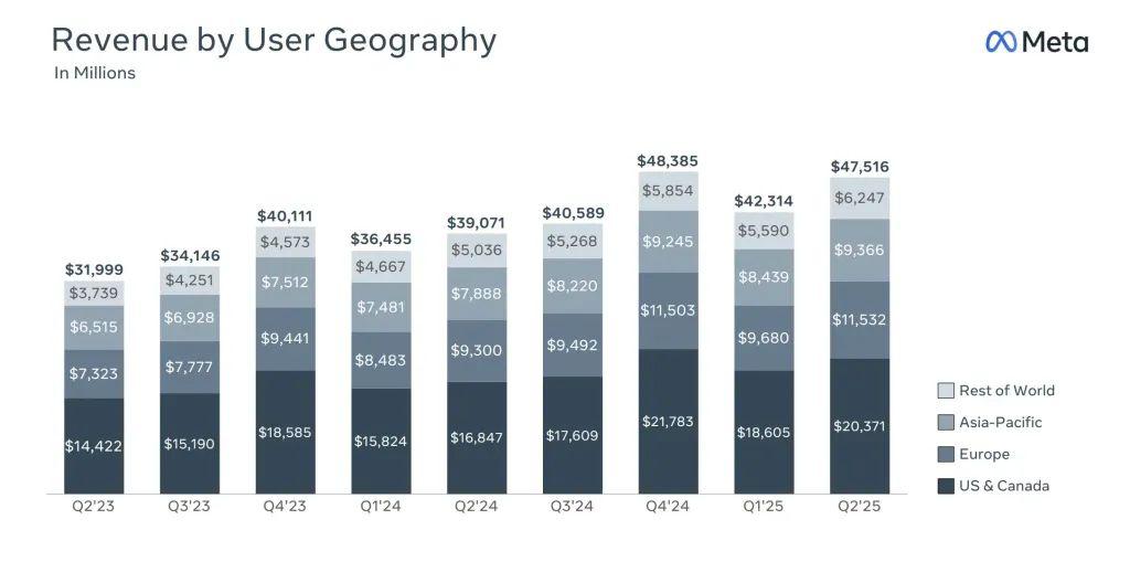 IT之家注意到,Meta 公司 7 月 31 日公布了 2025 财年第 2 财季财报(截至 6 月 30 日),营收为 475.2 亿美元(现汇率约合 3411.2 亿元人民币),同比增长 22%;公司净利润激增 36%,达到 183.4 亿美元(现汇率约合 1316.53 亿元人民币)。