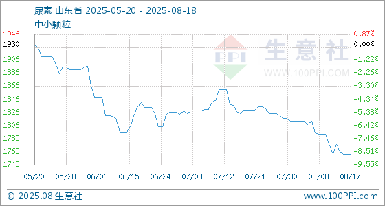 8月18日,生意社尿素基准价为1762.50元/吨,与本月初(1812.50元/吨)相比,下降了2.76%。