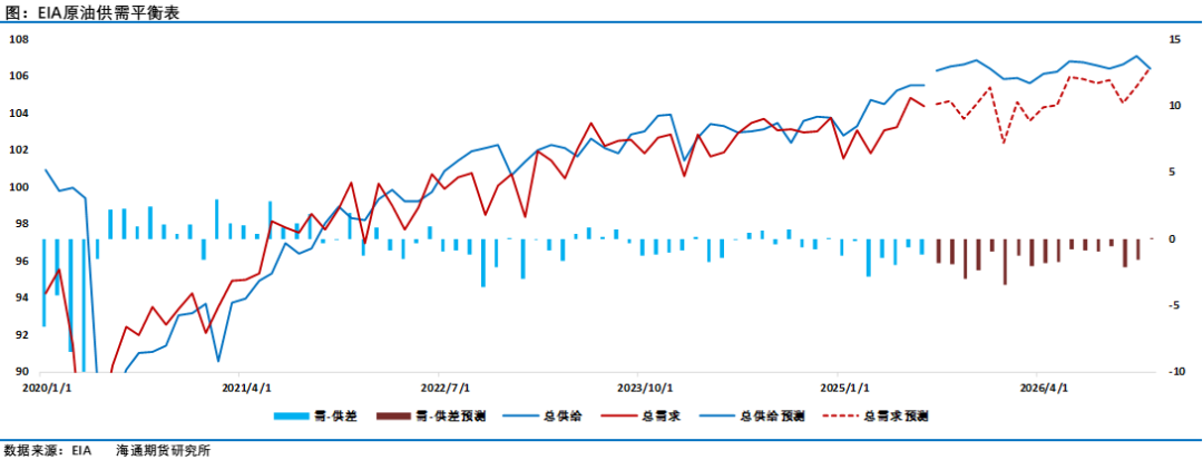 EIA的这一观点,在随后又得到了国际能源署IEA的确认,IEA发布月报称预计明年全球石油供应将出现创纪录的过剩情况。IEA在月报称全球石油库存将以每天296万桶的速度累积,甚至超过2020年新冠疫情期间的平均增幅。全球石油今明两年的需求增速都不到2023年的一半,IEA判断供应端持续扩张,欧佩克+加速重启暂停产能,美洲地区非欧佩克+国家产量预期被上调。IEA月报显示2025年全球石油供应增长预测从210万桶/日上调至250万桶/日,将2026年全球石油供应增长预测从130万桶/日上调至190万桶/日。而而美国贸易政策风险加剧市场担忧,美国总统特朗普的贸易举措可能进一步压制全球经济增长前景。将2025年全球石油需求增长预测从70.4万桶/日下调至68.5万桶/日。将2026年全球石油需求增长预测从72.2万桶/日下调至69.9万桶/日。