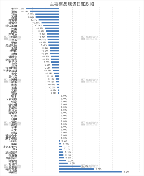 8月15日,卓创资讯监测商品现货市场12种上涨、36种下跌,16种企稳。宏观因素指引弱化,商品回归基本面定价,供应压力仍存。碳酸锂仍受制于供应端问题,价格继续走高。豆系相关商品价格则受贸易商出货影响,价格下跌。(价格涨跌幅均以卓创资讯监测现货商品均价或主流市场价格计算)