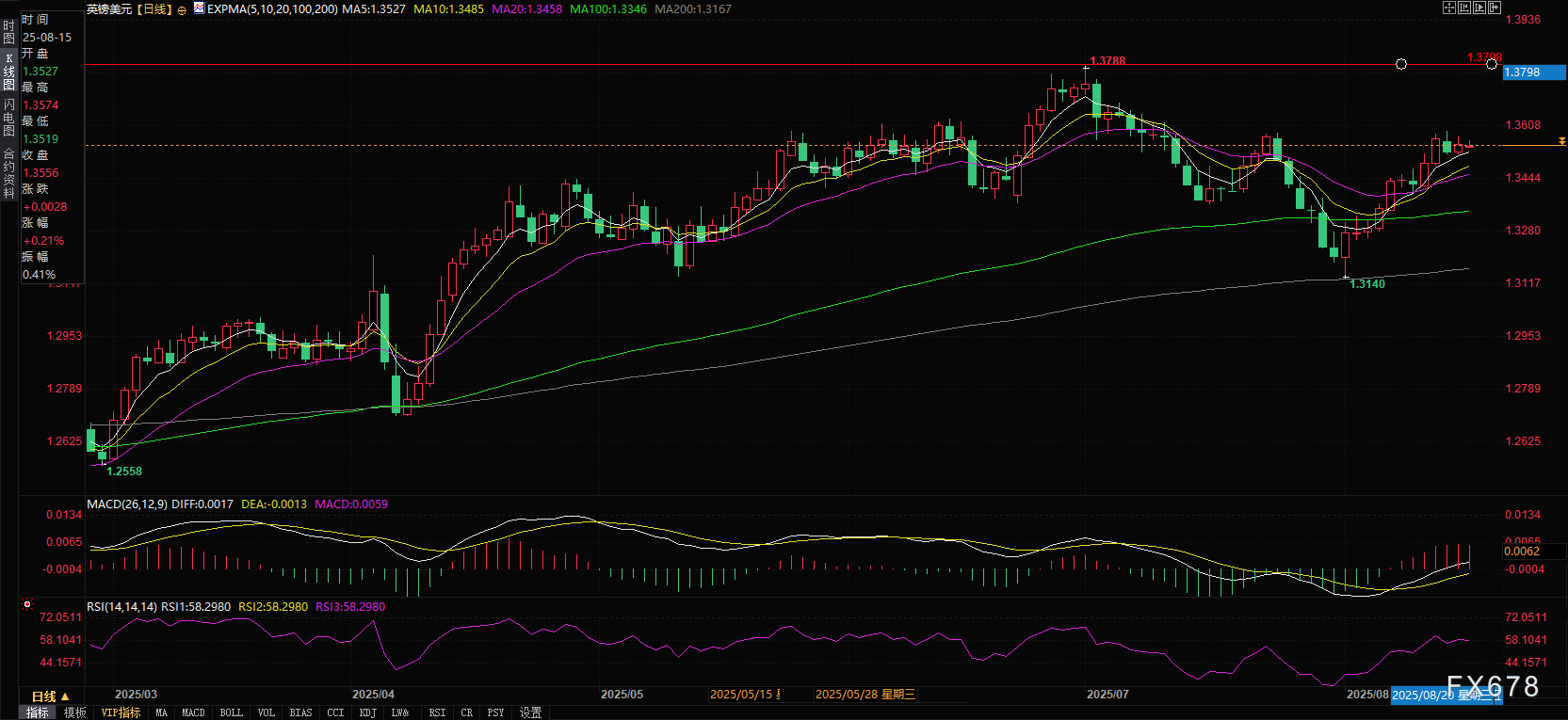 关键支撑位关注8月11日低点1.3400,上方阻力位则看向7月1日高点1.3790附近。