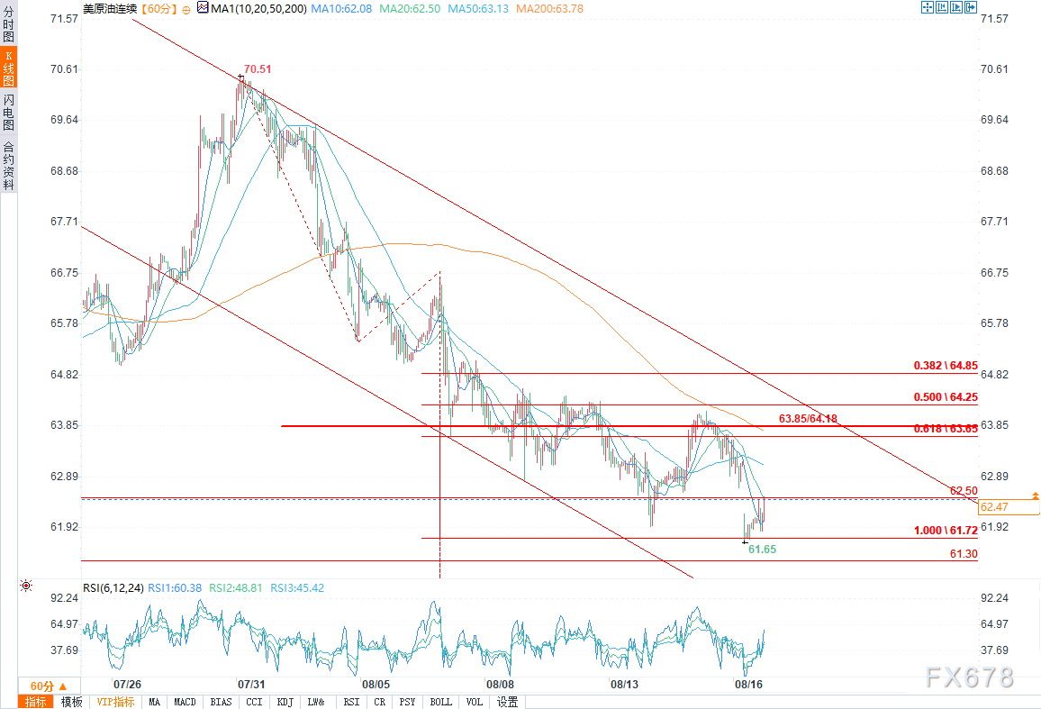 汇通财经APP讯——周一(8月18日),WTI原油在分时图上围绕62美元震荡,整体处于短期波动状态。短期看空趋势未完全消除。