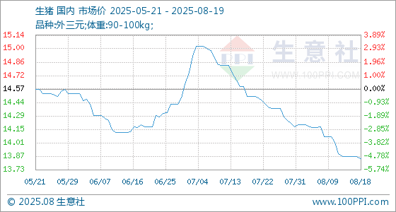 8月19日生意社生猪基准价为13.85元/公斤