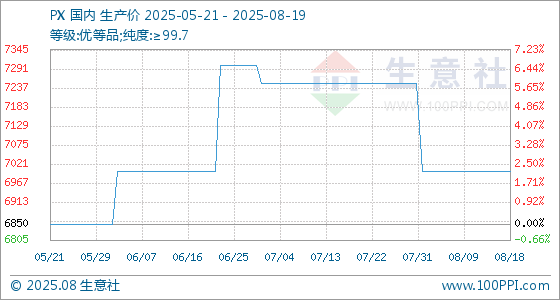 8月19日,生意社PX基准价为7000.00元/吨,与本月初(7250.00元/吨)相比,下降了3.45%。