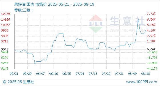 8月19日,生意社菜籽油基准价为9948.33元/吨,与本月初(9621.67元/吨)相比,上涨了3.40%。