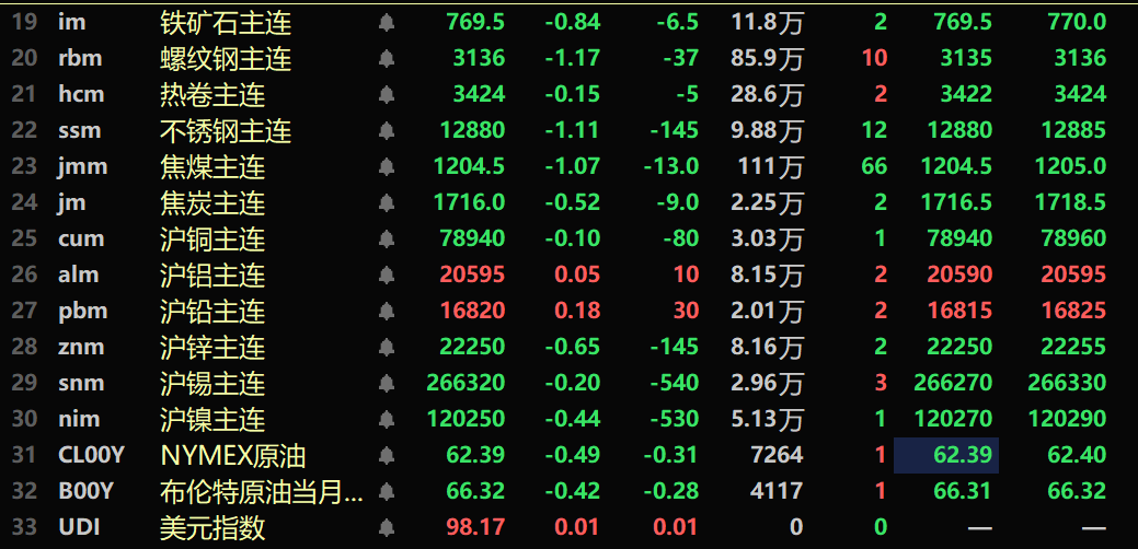 黑色系均飘绿,铁矿跌0.84%,螺纹跌1.17%,热卷跌0.15%。不锈钢跌1.11%。双焦方面:焦煤主力合约跌1.07%,焦炭主力合约跌0.52%。