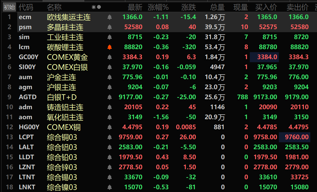 此外,铸造铝主连期货涨0.22%,氧化铝主连延续前四个交易日的跌势继续跌1.56%。碳酸锂主连跌0.36%,工业硅主连跌0.23%。多晶硅主连微涨。
