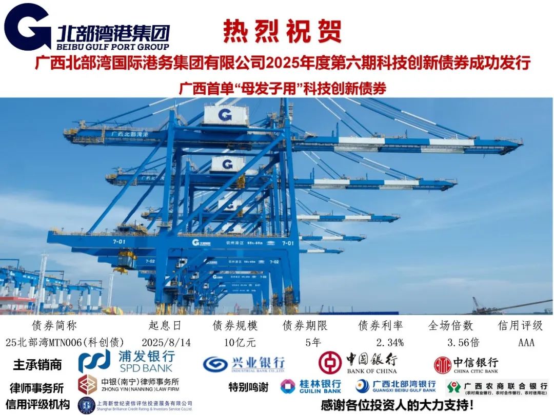近日,北部湾港集团成功簿记发行2025年度第六期科技创新债券,发行金额10亿元,期限5年,全场认购倍数3.56倍,票面利率2.34%。本期债券不仅是广西区域内首单“母发子用”模式的科技创新债券,其票面利率创下北部湾港集团五年期债券利率新低,较估值低12BP,充分彰显了资本市场对北部湾港集团发展实力与创新活力的高度认可。