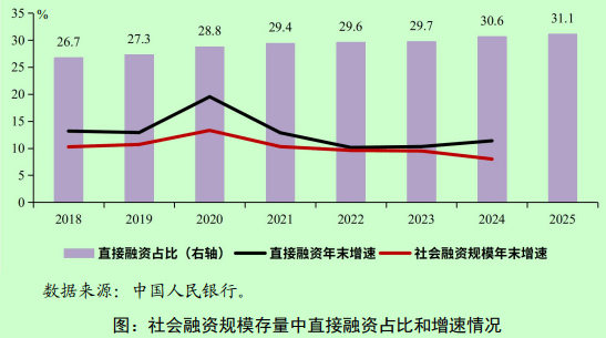 从社会融资规模存量构成看,企业债券、政府债券和非金融企业境内股票融资等直接融资占比已由2018年末的26.7%稳步提升至2025年6月末的31.1%,上升了4.4个百分点。