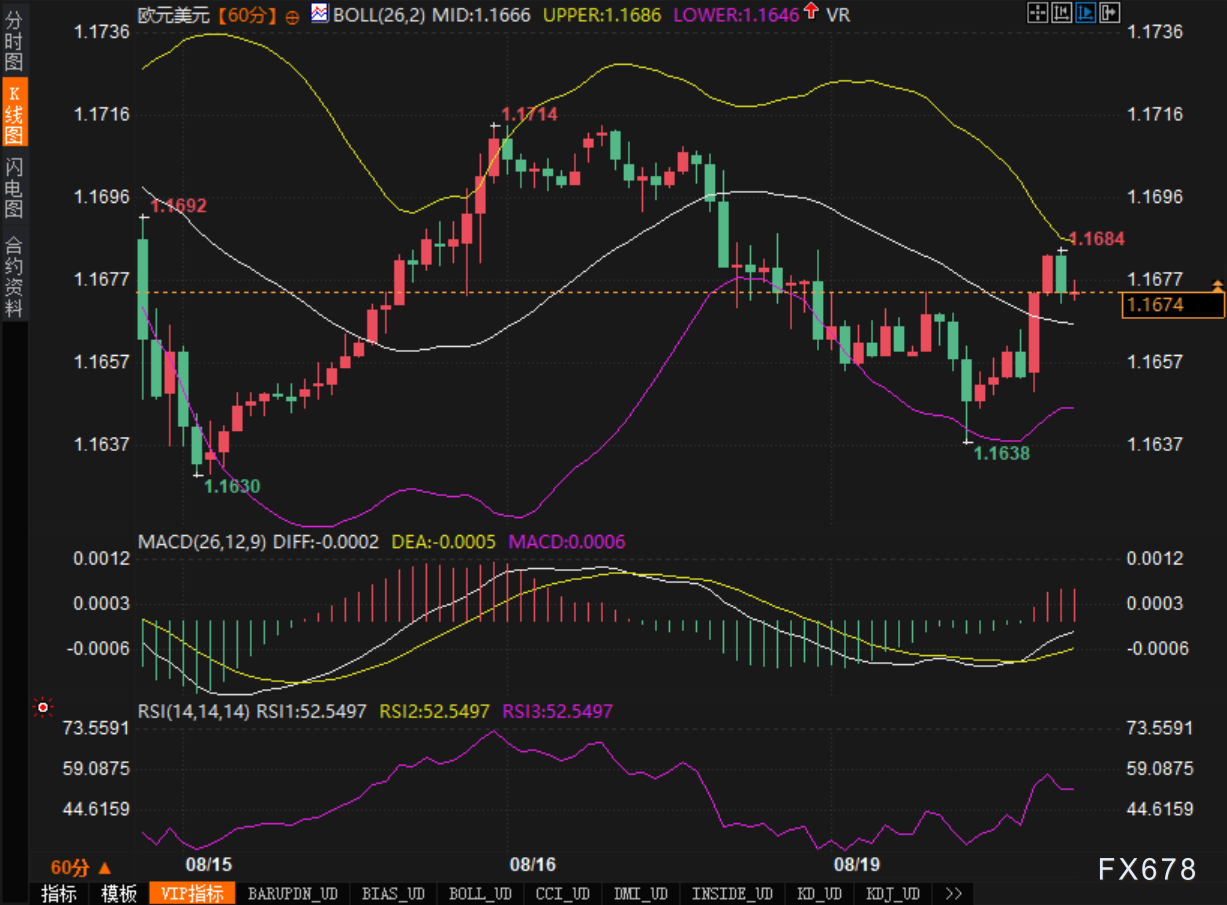 从小时图走势观察,欧元/美元在经历前期1.1714一线高点遇阻回落后,于1.1638附近寻得短期支撑,随后反弹至1.1684附近受阻。目前布林带指标显示,中轨位于1.1666,布林上轨在1.1686,下轨在1.1646,汇价运行区间较为清晰,呈现区间震荡格局。