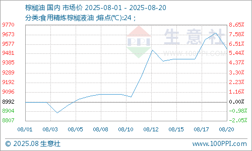 据生意社商品行情分析系统显示:8月开始,国内棕榈油行情涨跌互现,振荡上涨超半个多月。8月1日,棕榈油市场均价8992元/吨,8月20日,棕榈油市场均价9528元/吨,价格上涨5.96%。