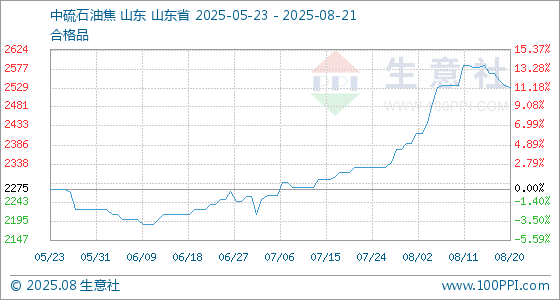 8月21日,生意社石油焦基准价为2530.00元/吨,与本月初(2390.00元/吨)相比,上涨了5.86%。