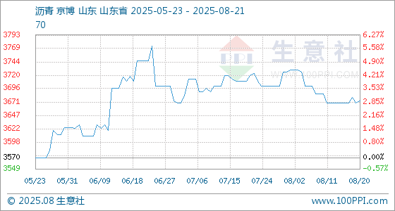 8月21日,生意社沥青基准价为3673.33元/吨,与本月初(3726.67元/吨)相比,下降了1.43%。
