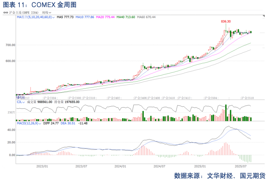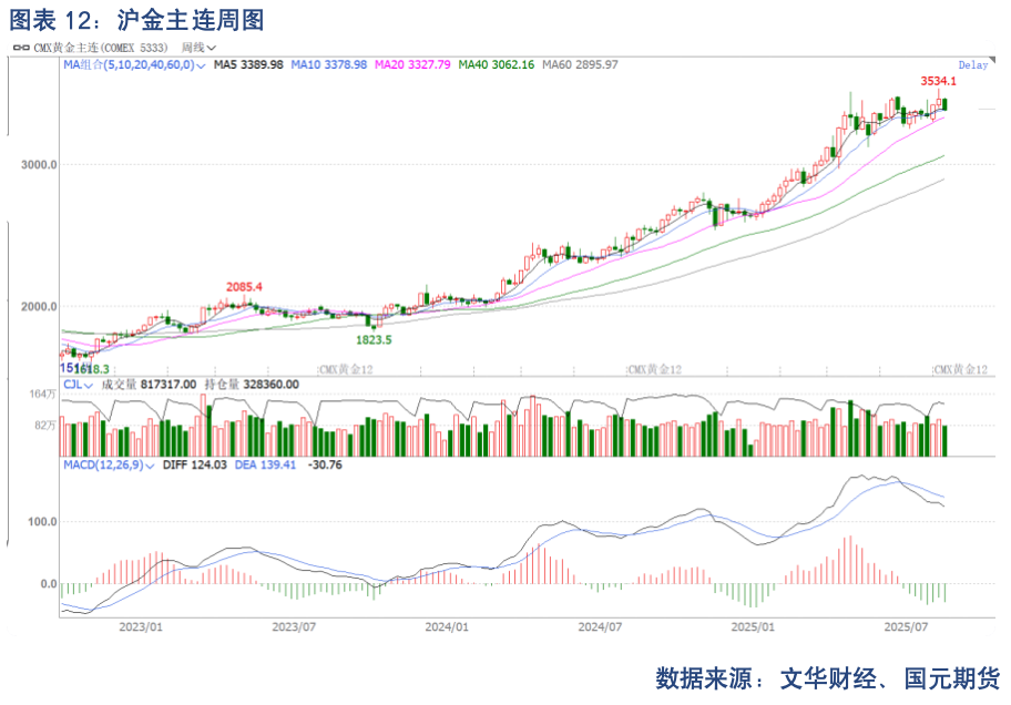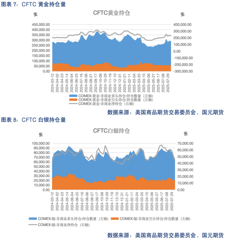 截至8月12日的周度统计周期中,黄金非商业多头持仓为288115 张,较上周减少4079 张,非商业空头持仓为58630张,较上周增加了3486张,基金净持仓减少7565 张,多头离场,空头进场,多头持仓变化更大。截至8月21日的周度统计周期中,白银非商业多头持仓为66252张,较上周减少了4982张,非商业空头持仓为21984 张,较上周增加1408张,基金净持仓减少了6390张,多头离场,空头进场,多头持仓变化更大。