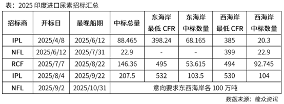 根据印度官方数据,二季度尿素销售量同比增长约12%,截至8月初印度尿素库存量仅371.9万吨,相比去年同期缩减了57%,并且当前正值印度的播种季节,尿素需求增长导致本土库存承压。2025年印度发布了4次进口尿素招标,如下表所示,总共已向国际采购了约465万吨的尿素,周期内最低CFR到岸价格增长将近40%。8月15日印度国家肥料公司(NFL)发布新一轮进口尿素招标,计划采购量200万吨。
