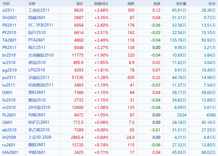 8月21日,午盘收盘,国内期货主力合约涨跌不一。工业硅、烧碱涨超3%,对二甲苯(PX)、短纤、PTA、瓶片涨超2%。跌幅方面,集运欧线、鸡蛋跌超2%。