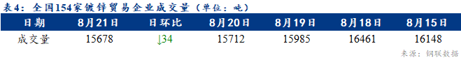 【成交情况】全口径154家镀锌企业出货量为15678吨,较上一交易日减少34吨,减幅0.22%。