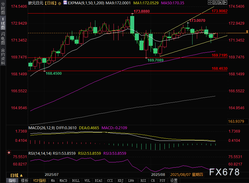 上行方面,初步阻力位于近期高点172.40,突破该关键阻力区域,将鼓舞看涨情绪,推动汇价上探2025年7月28日创下的2024年7月以来高点173.90,继而挑战上升通道上轨174.50附近压力位。