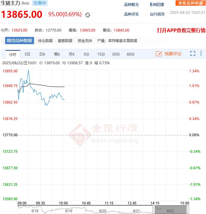 北京时间8月22日上午10:01分,生猪期货主力开盘走高,现涨0.69%,报13865元/吨。