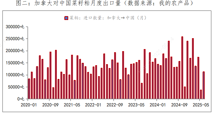 据我的农产品统计,2025年8月国内沿海地区进口油菜籽预估到港19.5万吨,9月13万吨,10月13万吨。若政策实施后出现洗船、违约等情况,预计国内菜油供给每月将减少5 - 8万吨,菜粕供给每月减少8 - 12万吨。目前,国内油厂油菜籽库存持续消耗,6 - 7月菜籽月度压榨量已明显回落,压榨产出的菜油、菜粕数量分别降至10万吨和15万吨量级。
