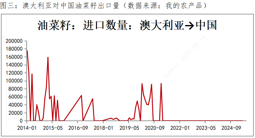 若无法开拓新的进口来源,中国油菜籽及相关产品供给将面临结构性短缺。极端情况下,可能需要澳大利亚油菜籽几乎全部出口至中国才能弥补缺口。然而,澳大利亚油菜籽年出口量有限,历史最高年份也不足50万吨。2025年3月起,中国已对加拿大菜油及菜粕加征100%关税。此后,中国虽开始增加从印度、阿联酋等国的菜粕进口,但对整体供给的补充作用较为有限。