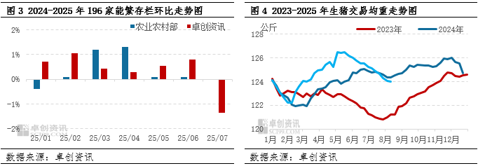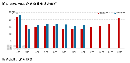 生猪屠宰量长期反映生猪供应量,因为活体生猪必须经过屠宰环节才能进入消费市场。2025年生猪屠宰量较去年提升明显,截至8月19日,全国主要屠宰企业日均屠宰量16.47万头,较去年同期水平增幅23.38%。而从季节性规律来看,当前已进入需求陆续上升阶段,天气转凉,以及院校陆续开学等提振需求,可以消化市场部分生猪供应压力,但据卓创资讯监测数据显示,需求端季节性增幅亦有限。