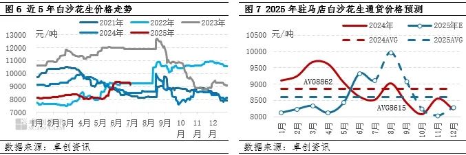 依据花生季节波动规律预测并通过行业经验进行修正,卓创资讯预计2025年下半年河南驻马店地区白沙花生通货米价格运行区间在8100-10000元/吨,均价较2024年下滑2.79%。