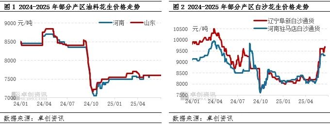 上半年,花生价格重心整体提升。其中一季度产区花生价格波动幅度在500元/吨范围内窄幅震荡,上涨及下探幅度均不大,二季度价格走高则较为明显,尤其是5月份以后。截至6月30日,卓创资讯统计山东油料均价为7604元/吨,同比下滑10.88%;河南油料均价参考7548元/吨,同比下滑11.50%;驻马店地区白沙通货米收购均价8428元/吨,同比下滑8.80%;阜新地区白沙通货米收购均价参考8477元/吨,同比下滑13.15%。