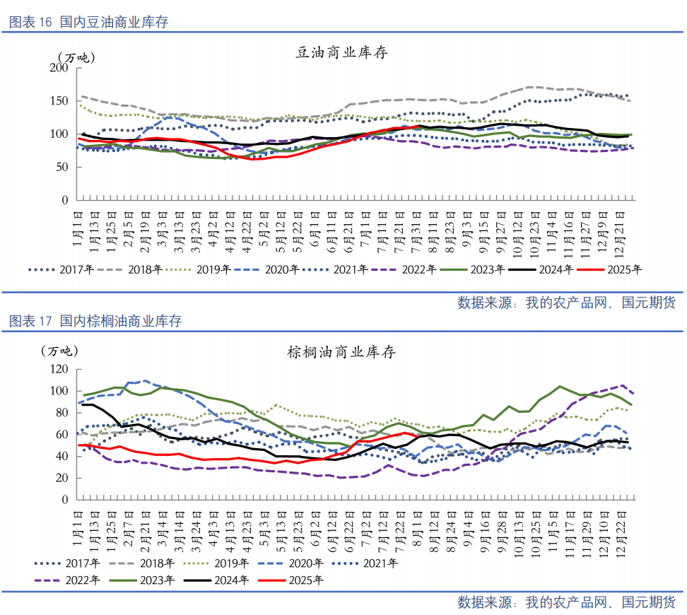 【印度食用油库存回升】截至8月1日,印度食用油库存连续第二个月回升,达171.6万吨,高于7月初的156.8万吨,但仍大幅低于去年同期的290.2万吨。其中港口食用油库存94.5万吨,包括毛棕榈油40万吨、24度精炼棕榈油4.5万吨、毛豆油25万吨、毛葵花籽油25万吨;流通渠道食用油库存77.1万吨。