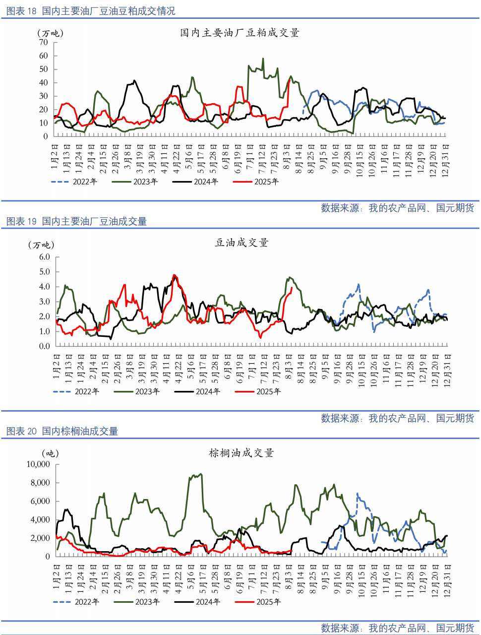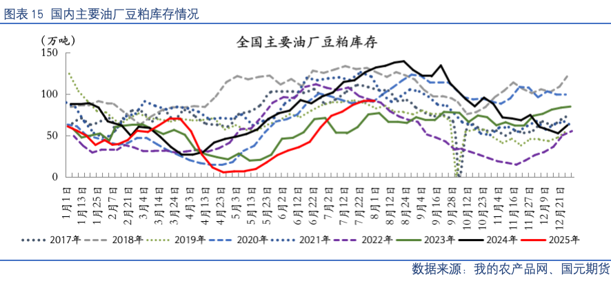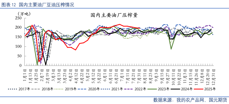 【豆粕】USDA8月供需报告影响阶段性交易出清,重点关注8月中下旬开启的Pro Farmer巡查结果对美国主产区大豆产量预估情况。国内进口大豆到港量维持高位,周度压榨开机率保持相对稳定,豆粕产出充裕;下游饲料企业采购节奏平缓,养殖端需求暂无明显增量,豆粕库存延续累库趋势,市场去库压力仍存。