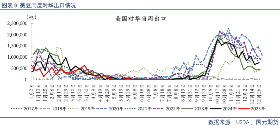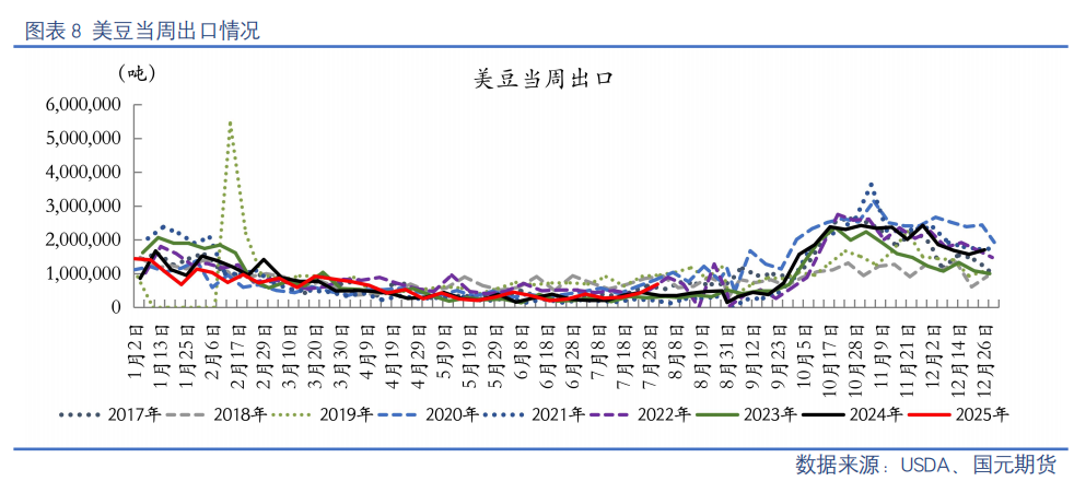 【出口检验:上周美国大豆出口检验量51.8万吨】美国农业部出口检验报告显示,截至8月7日当周,美国大豆出口检验量51.8万吨,高于市场预计的20~50万吨,上周62.8万吨,去年同期35.1万吨。2024/25年度迄今美国大豆出口检验量4836.8万吨,同比增长11.5%,达到全年出口目标5076万吨的95.3%。