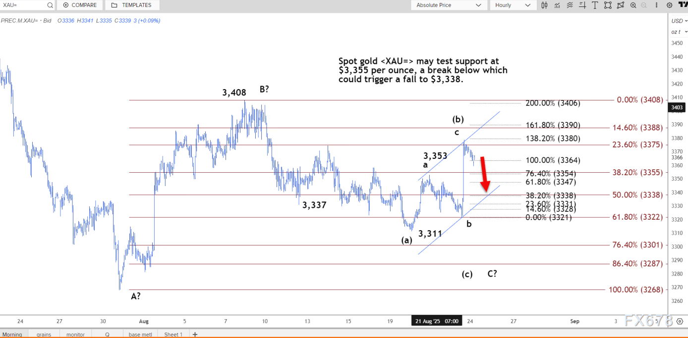 路透技术分析师指出,现货黄金可能测试每盎司 3355 美元的支撑位,跌破该水平可能跌至 3338 美元。