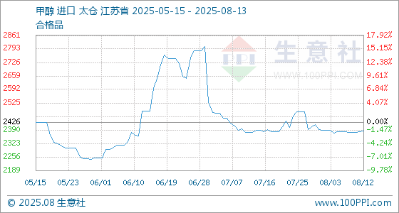 8月13日,生意社甲醇基准价为2384.17元/吨,与本月初(2393.33元/吨)相比,下降了0.38%。