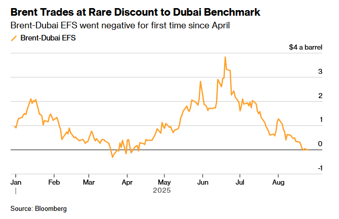 交易员预计,未来几个月市场将被大量原油充斥。OPEC+成员国和非成员国都在增加原油产量,这对布伦特期货造成压力,同时也削弱了时间价差这一衡量市场健康状况的指标。与此同时,对中东原油品种的需求得到了短暂提振,原因是印度炼油商的一波抢购潮,而这波买盘与特朗普因印度购买俄罗斯原油对前者施加的压力有关。