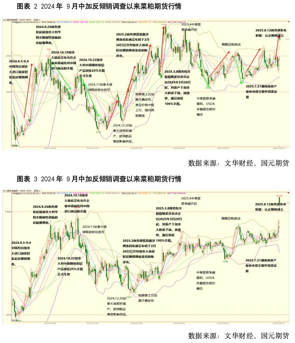 本轮中加贸易关系变化始自于2024年8月底,加拿大政府发布公告称,将对中国产电动汽车征收100%关税,以及对产自中国的钢铝产品征收25%的关税。2024年9月3日中国对加拿大油菜籽发起反倾销调查后,事件迅速升级:9月26日商务部再启反歧视调查,10月国内油厂抢船抢货,12月加拿大减产与欧洲航运事故叠加推高全球菜籽溢价;同年商务部对加拿大采取的相关限制措施发起“反歧视调查”。不过进入11月之后,随着加方不断释放软化信号,国内对菜系供应的忧虑逐渐降温。2025年2月底,中加举行反倾销调查意见陈述会,市场忧虑情绪再度升温。3月8日,中国宣布对自2025年3月20日起,对原产于加拿大的菜子油及油渣饼等加征100%关税。7月产业协会提交最终损害证据,8月12日商务部初裁倾销成立并征收75.8%保证金,标志中加农产品贸易争端进入关税对峙阶段。