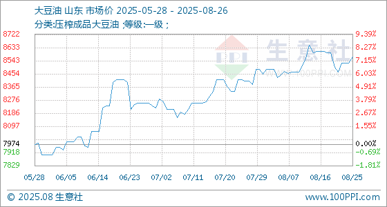 8月26日,生意社大豆油基准价为8568.00元/吨,与本月初(8454.00元/吨)相比,上涨了1.35%。
