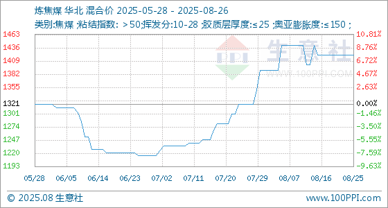 8月26日生意社炼焦煤基准价为1421.25元/吨
