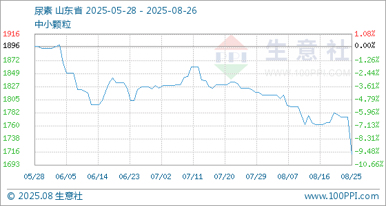 8月26日,生意社尿素基准价为1712.50元/吨,与本月初(1812.50元/吨)相比,下降了5.52%。